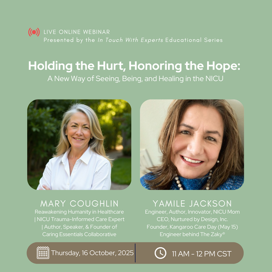 Join Mary E. Coughlin and Yamile Jackson for a powerful 60-minute webinar that explores how trauma, stress, and separation shape the NICU—and how trauma-informed care, skin-to-skin connection, and the healing power of presence can transform it.
